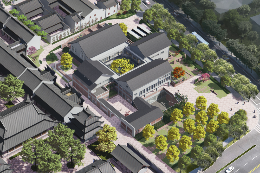 在研究七塔禅寺的历史演变进程时,我查阅了《鄞县通志》等史料。根据史料记载,七塔禅寺所处位置最初隶属城郊,随着城市变迁与交通发展,逐步成为中心城区的一座大寺院。寺院山门前原有一条小河,河对岸有一排民居,香客需穿桥过屋,方能抵达寺门礼佛;然而,随着30年代的填河造路,寺院门口的河道被填平,桥梁不复存在;后随着城市道路的扩张,原有房屋也被拆除,寺院的山门便直接面向今日宽阔的百丈路。这一系列历史变迁使原本存在的“世俗-神圣”过渡空间被压缩乃至消失,所以在“三馆三园”项目设计中,我有考虑如何对这段距离加以弥补。