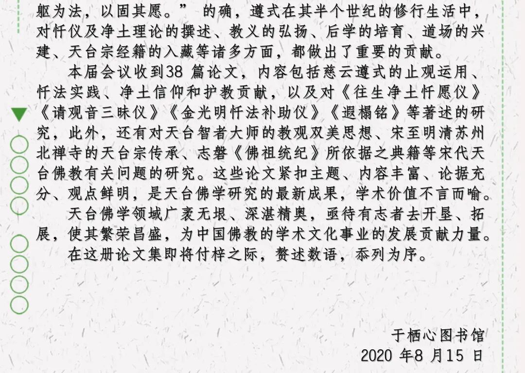 2019年,时值遵式大师诞辰1055周年。为纪念这位北宋天台宗山家派的著名高僧,七塔禅寺以“慈云遵式与宋代天台佛教”为主题举办了第三届天台佛教学术研讨会,邀请海峡两岸二十余所高校和科研院所的30多位专家学者撰文对遵式大师的教理思想、宗教实践、生平事迹和历史贡献等方面进行了全面深入的研究。2021年2月,研讨会论文集《天台佛学研究 第三辑:慈云遵式纪念专辑》正式由宗教文化出版社出版,并收入“七塔报恩丛书”系列。