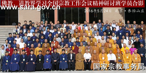 2016年5月23日至27日,国家宗教局在京举办佛教、道教界学习全国宗教工作会议精神研讨班。中国佛教协会、中国道教协会会长、副会长、秘书长、副秘书长,各省、自治区、直辖市佛教协会、道教协会会长,宗教工作部门有关负责人共160余人参加研讨班。研讨班期间,国家宗教局副局长蒋坚永传达了全国宗教工作会议精神,一司司长王健做佛教、道教界贯彻全国宗教工作会议精神辅导报告,中国佛教协会会长学诚法师、中国道教协会会长李光富道长做学习全国宗教工作会议精神心得体会的报告。研讨班安排了多场分组研讨、大会交流。中国佛教协会、中国道教协会分别召开会长扩大会,研究部署贯彻落实全国宗教工作会议精神工作。