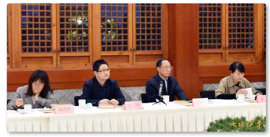 座谈会由浙江省民宗委宗教研究服务中心主任金茹主持,省民宗委宗教研究服务中心副部长班泰勇等出席座谈会,七塔禅寺监院界义法师、定光法师、常明法师等参与接待,并列席。
