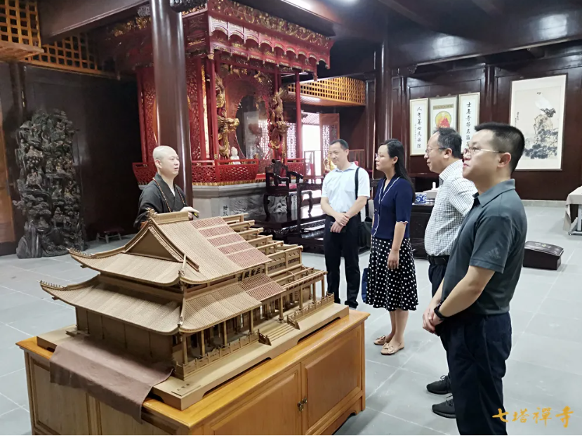 2021年7月22日上午,宁波市文化广电旅游局党组成员、副局长马荧波,文物与博物馆处处长李怿人一行,在鄞州区百丈街道党工委书记葛焕陪同下,来到七塔禅寺考察古建筑修缮和文物保护工作。