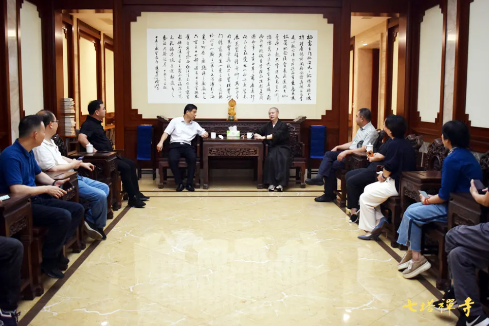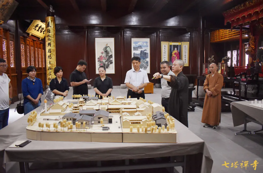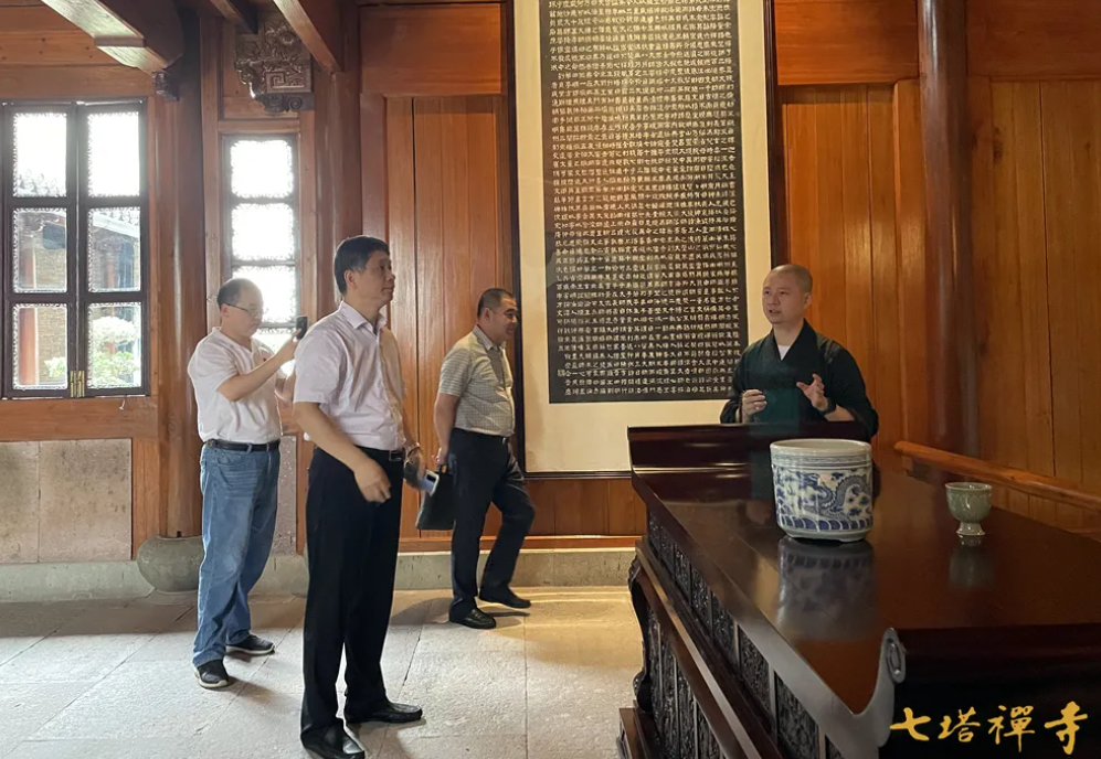 2021年7月9日上午,杭州市民宗局党组成员、二级巡视员王德好率队在宁波市民宗局党组成员、二级巡视员常晓波的陪同下考察七塔禅寺。