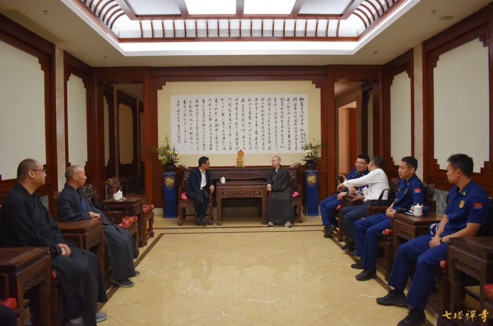 七塔禅寺住持可祥法师在报恩大讲堂会客厅接待了罗军雷一行,和他们分享了七塔禅寺近二十年来开展消防安全工作的经验。可祥法师表示,消防硬件设施的改造和提升固然重要,但僧众和工作人员消防安全意识的培养更为重要,只有思想上绷紧消防安全弦,才能确保消防工作落实到位。