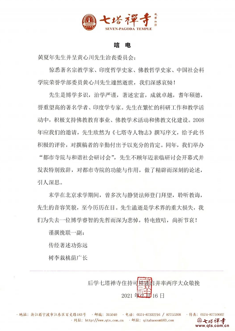 著名佛教学者、印度学专家、中国社会科学院荣誉学部委员黄心川先生于2021年2月10日上午11点33分在北京逝世,享年93岁。黄心川先生不仅是一位学识广博的大学者,也是一位关心支持佛教发展的大善知识,对七塔禅寺的文化建设事业多有指导与帮助。曾于2008年出席七塔禅寺举办的“都市寺院与和谐社会研讨会”,发表重要讲话,对寺院的现代化建设提出了许多指导性建议。惊闻老先生逝世,七塔常住不胜悲痛,特建往生普佛法会,以表悼念。七塔禅寺住持可祥法师代表两序大众撰唁文以寄哀思,并向黄先生家人致以诚挚慰问!