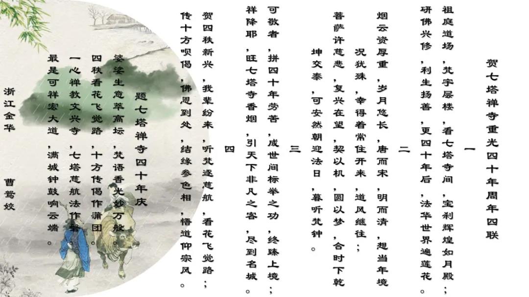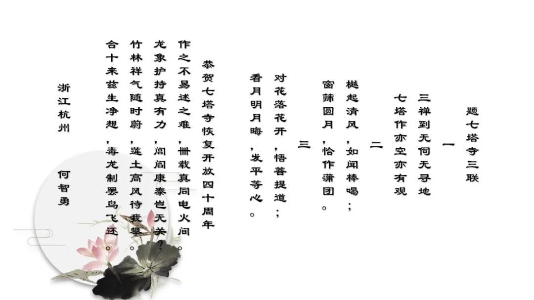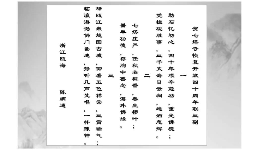 可祥法师表示,诗词楹联是中华文化之精髓,华夏文明之瑰宝,以高度凝练的语言反映历史文化和社会生活,是形象表达作者思想情感的重要文学形式。自古佛教寺院的发展得益于包括佛教文化在内的传统文化的滋养与浸润,许多佛寺亦因诗文而名闻遐迩。因此,举办纪念七塔禅寺恢复对外开放四十周年诗词楹联吟诵会是一件具有历史和文化意义的盛事。
