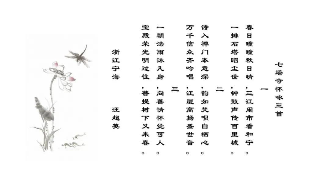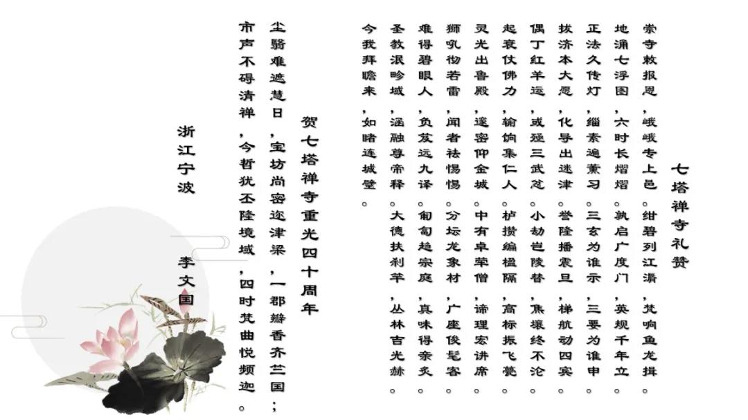 吟诵会由宁波大学人文与传媒学院硕士生导师、浙东佛教文化研究院执行院长张凯博士致闭幕词。他在致词中表示,古诗词有着巨大的精神力量,常常会潜移默化地改变一个人的气质,提升一个人的境界。佛教与诗词的关系,可谓至深至密,寺因诗名,诗因寺显,历代文人多有对佛教情有独钟者,诗僧历代不乏其人。七塔禅寺近年来一直秉承“文化兴寺”的发展方向,创造性地开展了许多文化事业与工程。诗词楹联是文化的重要载体和组成部分,因此也是七塔禅寺文化建设中的题中应有之义。感谢参加盛会的诗词家们用生花妙笔,使七塔禅寺这座千年古刹再添新彩,熠熠生辉。