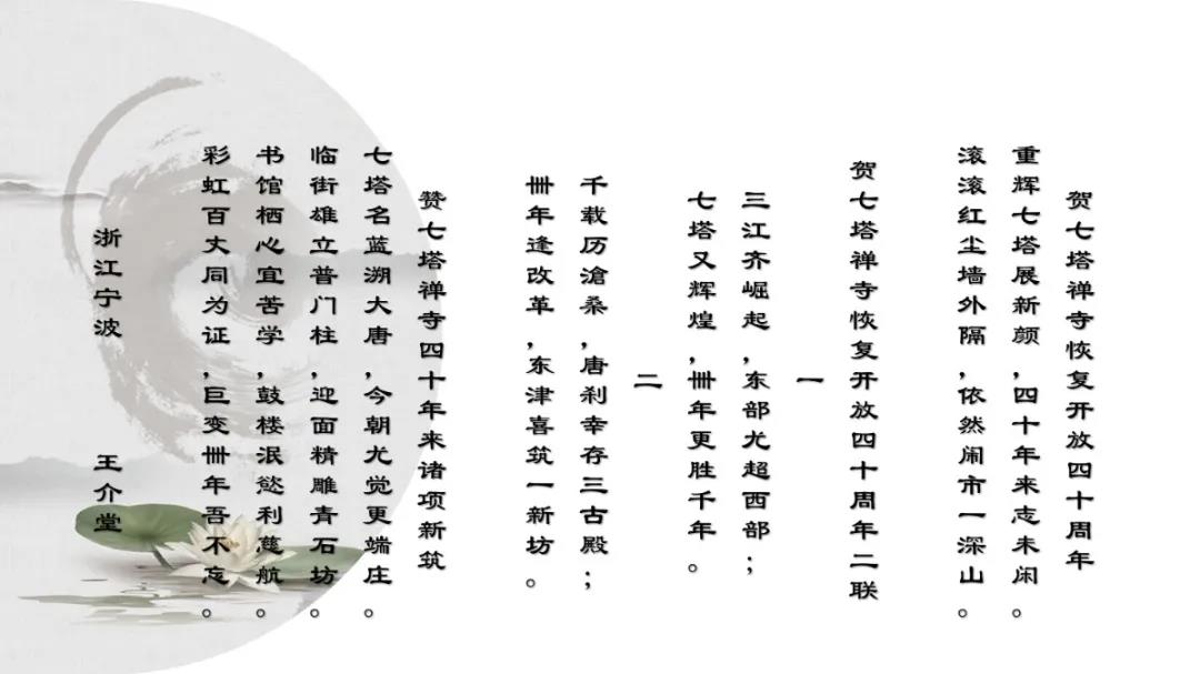 浙江省诗词楹联学会副会长章剑清先生高度评价了此次参会的作品。他指出,七塔禅寺以诗词楹联吟诵会的形式纪念恢复对外开放四十周年,展示了开放的姿态、博大的情怀和高雅的文化品位。参会作品体裁多样,表现形式丰富,内容工文雅正、寓意深刻,堪称精品佳作。