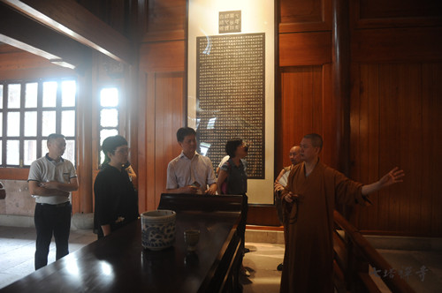 七塔禅寺住持可祥法师陪同钱秋萍副主任一行参观了圆通宝殿、三圣殿、法堂等古建筑和“西扩工程”,介绍了寺院在古建筑修缮保护和消防管理上的具体方法和措施。当了解到七塔禅寺开山祖师心镜藏奂禅师祖籍苏州华亭时(今上海市松江区),考察团一行都颇感因缘殊胜。