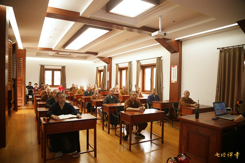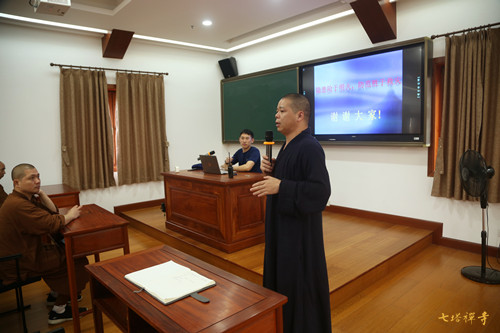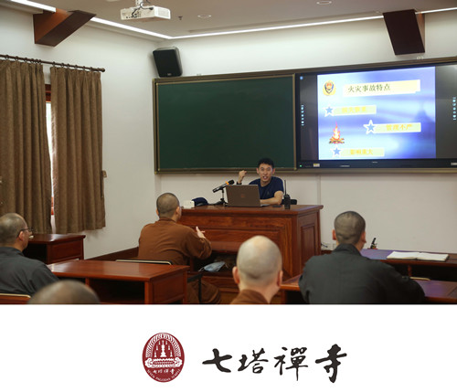 2020年7月17日上午,七塔禅寺特邀宁波市鄞州区消防救援大队福明站陈悦锋副站长来寺开展消防安全培训讲座。七塔禅寺常住法师、工作人员和部分义工参加了培训。讲座由七塔禅寺监院定光法师主持,省消防总队监督处杨张捷处长作总评。