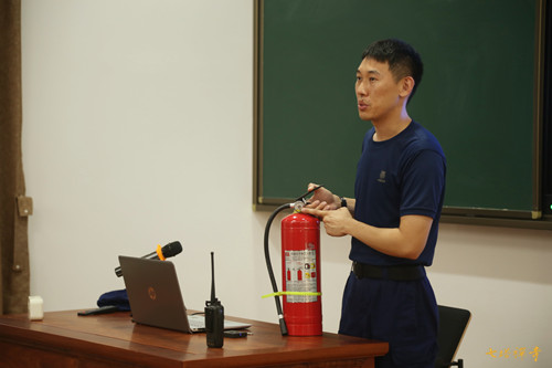 ▲ 陈悦锋教官演示干粉灭火器使用方法