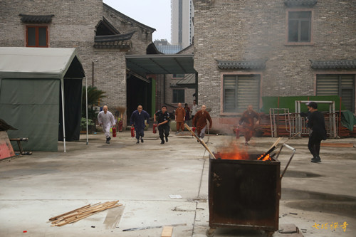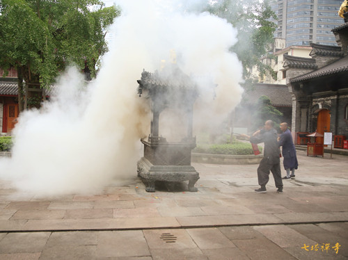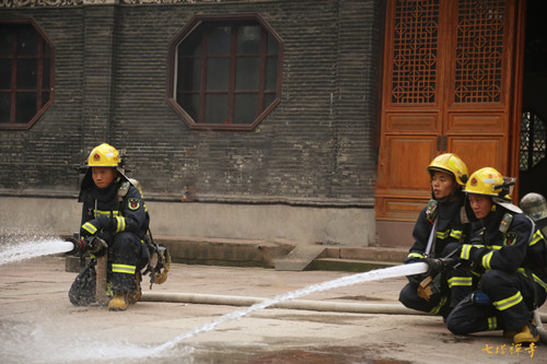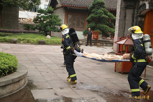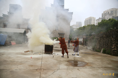 讲座结束后,七塔禅寺消防安全管理小组的法师、保安人员和鄞州区消防救援大队的消防员们在圆通宝殿前的广场上进行了灭火救援联合演习。
