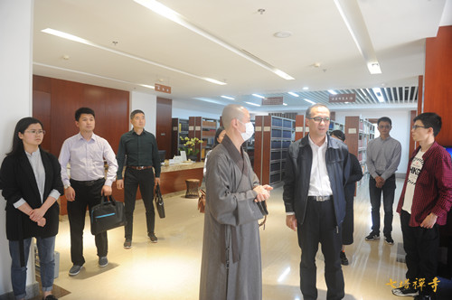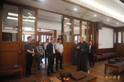 七塔禅寺住持可祥法师陪同马继宁一行参观了圆通宝殿、三圣殿、法堂等主体殿堂,以及禅学堂、栖心图书馆、报恩大讲堂等学修场所,详细介绍了寺院近年来在日常学修、基础建设、文化推广、对外交流等方面所做的具体工作。