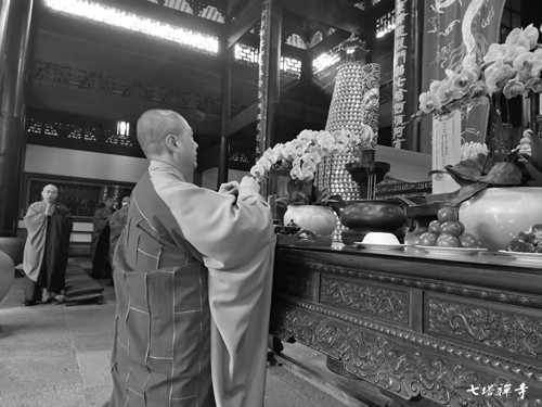 上午9时,七塔禅寺僧众在圆通宝殿内,举行诵经祈愿法会,深切缅怀抗击新冠肺炎疫情中牺牲烈士和逝世同胞。祈愿:烈士精神永存,逝者得生净土;国基永固,百姓安康!