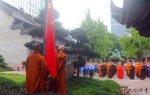 上午10时,天朗气清,惠风和畅。伴随着庄严的国歌声,鲜艳的五星红旗在圆通宝殿前冉冉升起,僧俗两众整齐肃立,行注目礼。
