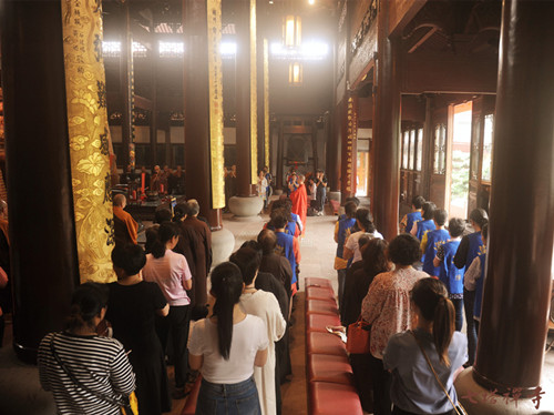 随后,全体人员移步至圆通宝殿内,止语收摄身心,参加祈福法会。