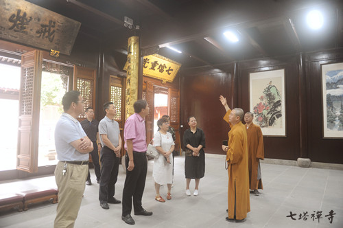 可祥法师引领郭纪兵副局长一行,沿中轴线依次参观了圆通宝殿、三圣殿、法堂、祖堂等寺院主体建筑,并向郭纪兵副局长详细介绍了各殿堂的修缮状况和殿内陈列的诸多珍贵历史文物。在供奉寺院开山祖师心境禅师舍利的祖堂内,可祥法师详述了七塔禅寺的建寺历史和开山祖师心境禅师的弘法事迹。郭纪兵局长感慨道:“每一处丛林都是一座历史博物馆。”