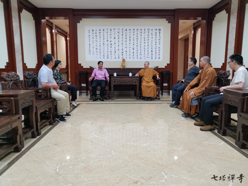 2019年9月20日上午,舟山市民宗局郭纪兵副局长一行,在宁波市民宗局副局长周悦德,鄞州区民宗局局长荆英姿的陪同下,来到七塔禅寺调研。七塔禅寺住持可祥法师以及诸位监院法师参与接待。