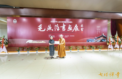 毛燕萍老师对七塔禅寺和可祥法师以及帮助促成此次书画展的相关领导、老师和朋友表达了感恩之情。她表示,这次展览缘起十分美好,因为发心是完全地利他而非利己;过程有曲折,但是给了我们面对困难的勇气,也提升了我们克服困难的智慧;结果是圆满的,因为正念正行,因为有诸多善知识的共同努力。毛老师决定将展出的88件书画作品悉数捐献给七塔禅寺,并祝愿大家“心如皓月,光明圆满”。随后,可祥法师向毛燕萍老师颁发了捐赠证书。
