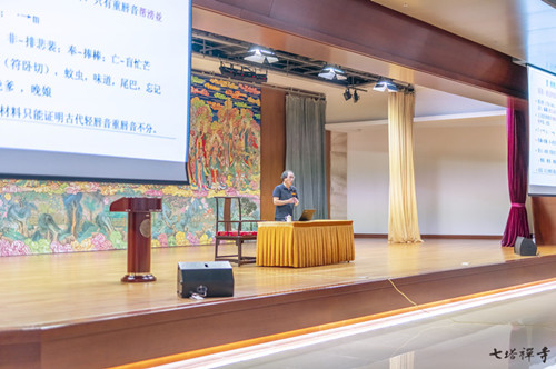 周志锋老师首先从清代语言学家钱大昕通过举证南无阿弥陀佛的“南无”的发音,证明上古没有轻唇音,只有重唇音。这一学术成果入题,介绍了佛教文献在古汉语发音、生僻字、词汇释义的研究等方面所具有的重要学术价值。
