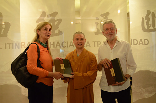 ▲Maria Anton Barco代表马德里建筑师官方协会向可祥法师赠送欧洲建筑书籍