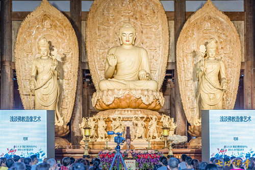 可祥法师首先从“佛教造像艺术的产生和分类”说起,他阐释道:佛教造像艺术应运而生的原因有二:一是为了追念佛陀,二是为了宣扬佛教教义;从广义来说佛教造像分为两大类:一类供在寺庙、宫廷和民居内,一类雕塑在石窟寺中。