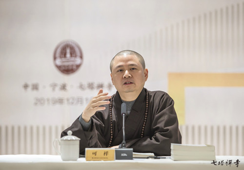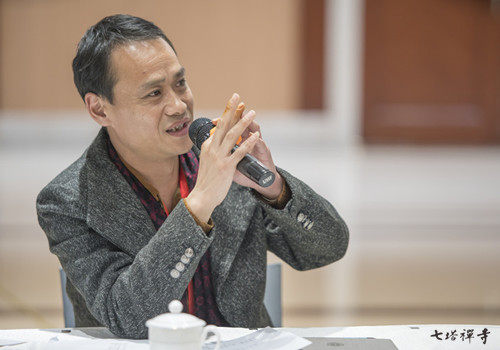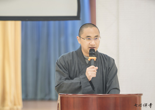七塔禅寺住持可祥法师在开幕式上致辞,他简要介绍了七塔禅寺的建寺史略,以及举办此次诗联会的缘起之后,他谈了佛教与诗联、以及诗联对他自己的影响,着重从三个方面展开论述:一、寺因诗而名、诗因寺显;二、古来高僧大德常以诗词偈颂表达悟后境界;三,诗联激励着我奋发向上,影响着我宽厚待人。