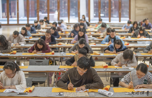 最后,毛老师以文征明小楷为例,现场示范了几个楷书的单字,让学员们细细体会行笔的节奏、跳跃感及布白的疏密、避让。余下的时间里,在几位导师的辅导下,学员们反复进行了单字的练习。