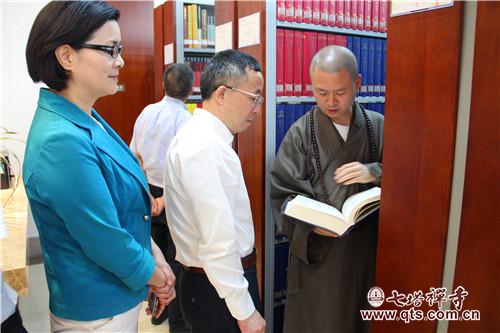 上午,在宁波市市委统战部副部长、宁波市民宗局金黎萍局长等领导的陪同下,可祥法师引领傅部长一行参观了寺内主要殿堂、历史古迹及栖心图书馆。