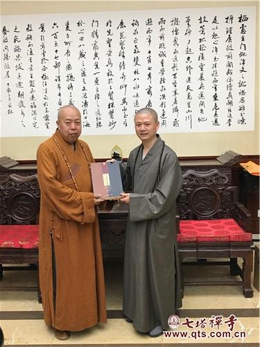 住持可祥法师在完成接待任务后,及时来到会客厅会见“参访团”,对妙真法师一行来访表示热烈的欢迎,并介绍了七塔禅寺的“双风”、文化、僧才建设,以及外友好交流情况。他回顾了自己曾多次朝拜五台山文殊菩萨道场的因缘,畅谈了对山西佛教文化的理解和认识。妙真法师对七塔道场的像器庄严,环境雅致,管理规范,弘法教育事业的成绩赞叹不已,希望日后继续互相学习、互鉴交流。