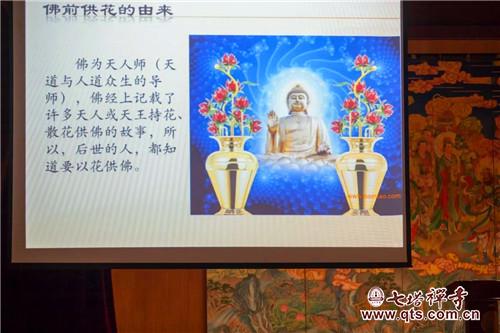 随后,王老师引经据典,用“借花献佛”的典故,讲述佛前供花的由来;用佛陀在灵山说法时“拈花微笑”的故事,说明以花供佛,会产生不可思议的功德。此外如《佛为首迦长者说业报差别经》等经典告诉我们,用香花供佛,可得十种功德。从南北朝开始,中国就形成了以花供佛的优良传统,随着花种、盛器和插花造形的日益丰富,神州大地上多样的花卉因此而具备了佛法佛义的象征,供花的仪式也被赋予了强烈的神圣观和信仰的力量,“一花一世界,一叶一如来”成为佛门修行悟道者的心境流露及文化艺术界人士所津津乐道的永恒话题。