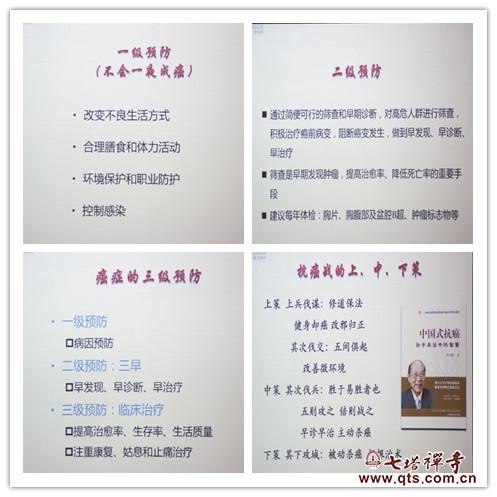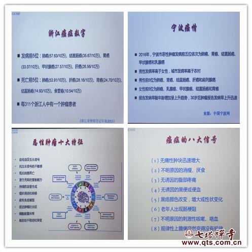 张俊教授首先介绍了“上海癌症数字”、“浙江癌症数字”及“宁波患癌率”的情况,紧接着详细阐述了“肿瘤离我们有多远”、“肿瘤的十大特征”、“癌症的八大信号”、“癌症的三级预防”等内容。张俊教授认为,对晚期肿瘤的治疗从“除瘤务尽”到“带瘤生存”的转变,在一定程度上体现了哲学思想在治癌理念演进中的融合效应。