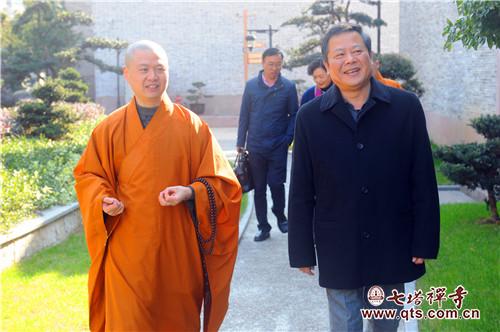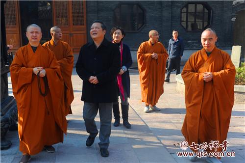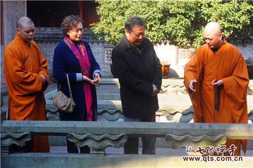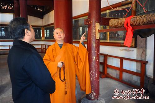 王勇主任一行在可祥法师等执事的引领下察看了天王殿、圆通宝殿、三圣殿、法堂、开山舍利塔院等历史建筑和禅学堂、报恩大讲堂、栖心图书馆等新建置。可祥法师向王勇主任一行汇报了七塔常住近十多年来在历史建筑修缮上所做的主要工作,以及新建置的建设理念和使用功能。王勇主任充分肯定七塔常住在科学保护历史建置及佛教文物方面所做的工作,非常赞赏新建筑的文化功能及社会服务功能。