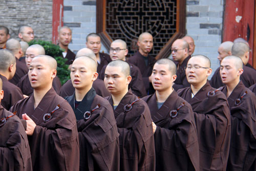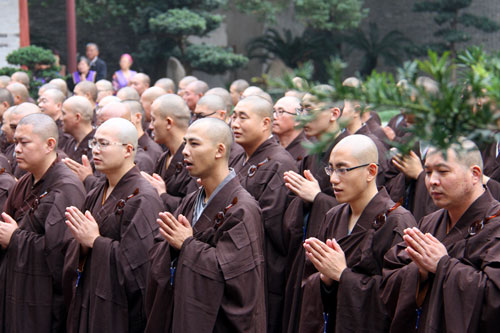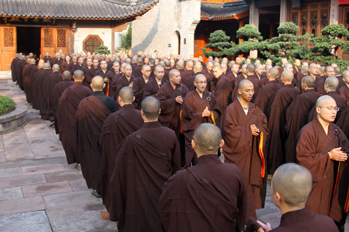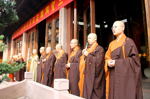上午8时,教三坛正授仪式在七塔禅寺圆通宝殿广场举行,众新戒长跪合掌乞请受清净戒法。开堂大初律师的细心教导,令众新戒受益匪浅。