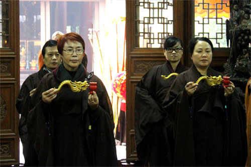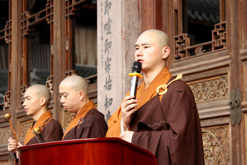 上午10时许,上堂大斋说法仪式在三圣殿举行,由护法居士黎桂宝等供养众新戒。