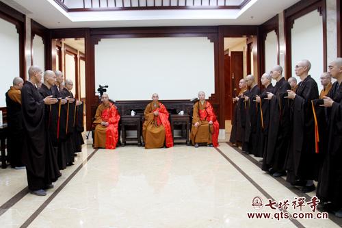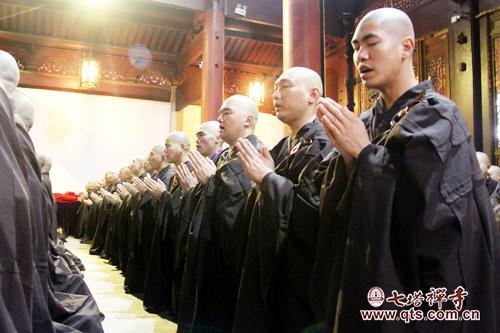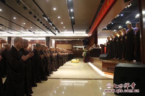 2016年11月7日上午8时许,七塔禅寺传授护国兴圣三坛大戒法会举行二坛请戒仪式,报恩大讲堂内清净庄严,众新戒威仪具足,依次排班迎请得戒和尚诚信法师、羯磨阿阇黎可祥法师(代)、教授阿阇黎监院界义法师(代)登堂说法,众新戒合掌跪拜,至诚聆听。