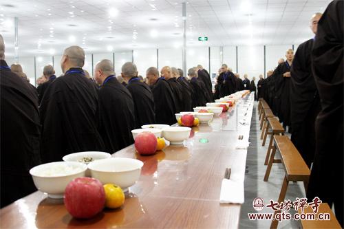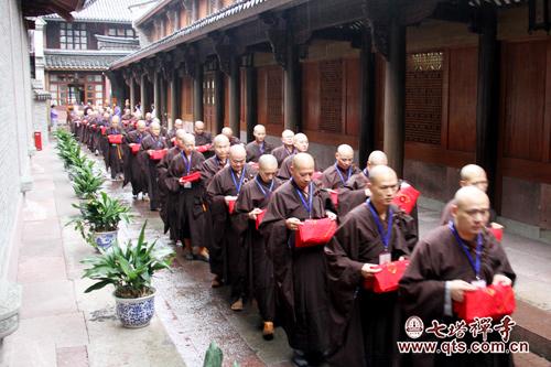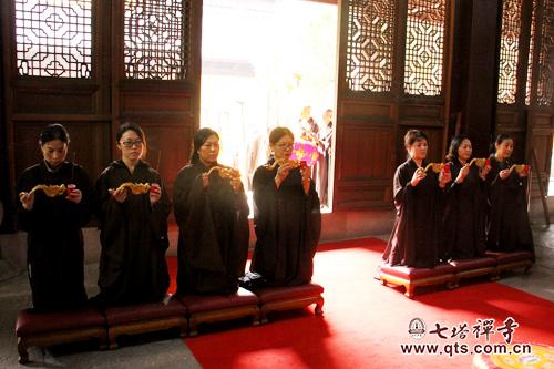 是日上堂大斋法会由胡世意等居士供养新戒菩萨及七塔禅寺全体常住法师,众新戒弟子依次排班,齐集三圣殿,斋会由开堂大初律师主持并上堂说法。