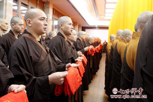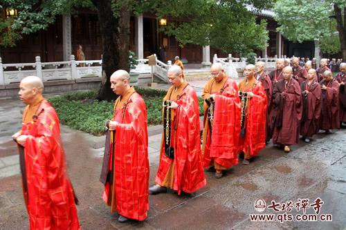 8日上午8时,七塔禅寺传授三坛大戒法会举行正授比丘戒登坛仪式,天降甘霖,洒净坛场。斜风细雨的清晨,七塔禅寺戒场显得尤为清净、庄严。众新戒齐集三圣殿,依次迎请引礼师父、七尊证阿阇黎、羯磨阿阇黎、教授阿阇黎、得戒和尚登坛。戒子向十师至诚顶礼三拜,长跪合掌,随引礼师虔敬唱念,愿从三师乞受佛陀清净戒法。