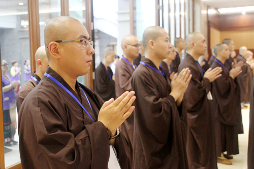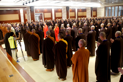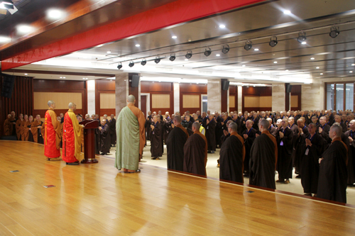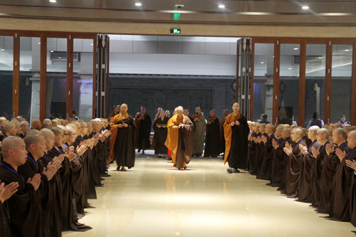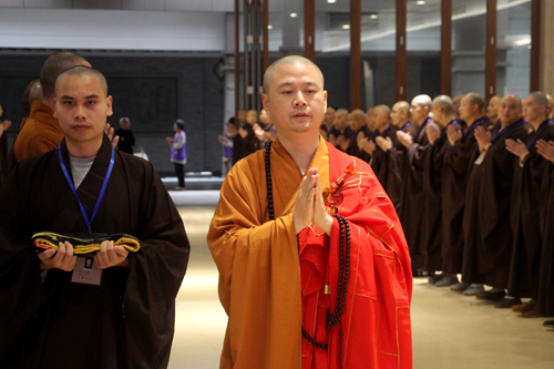 上午9时许,新戒在报恩大讲堂两侧排班迎请得戒和尚诚信法师、教授和尚可祥法师步入讲堂,双手合十,至诚恳切称念“南无本师释迦牟尼佛”,场面殊胜庄严。