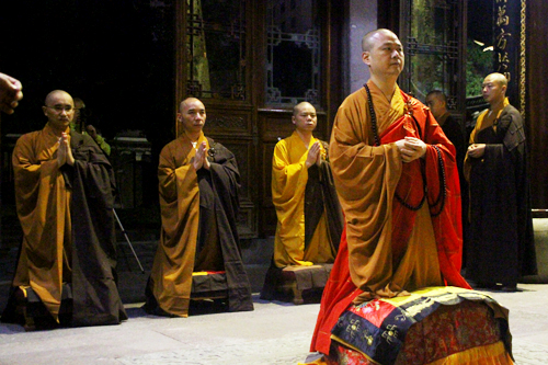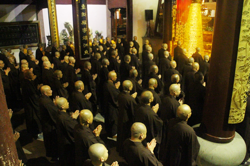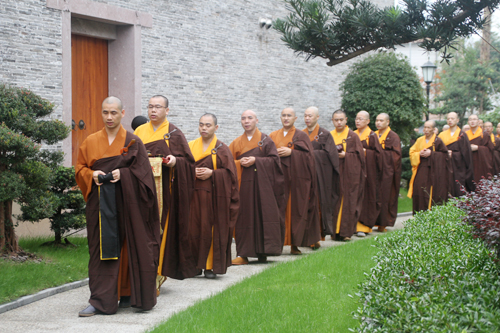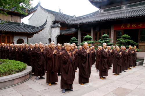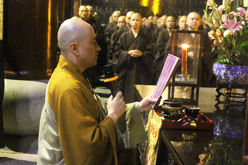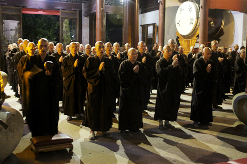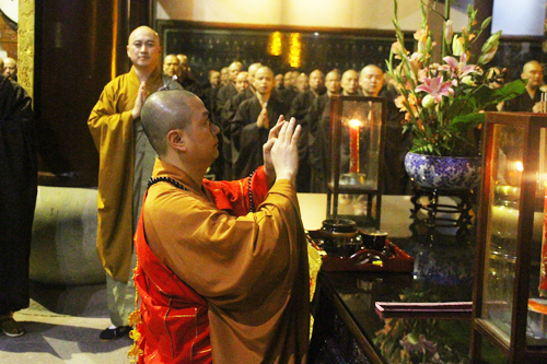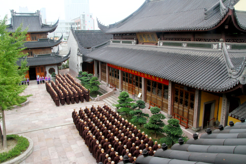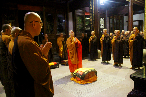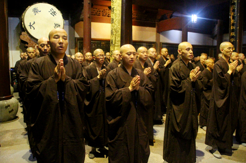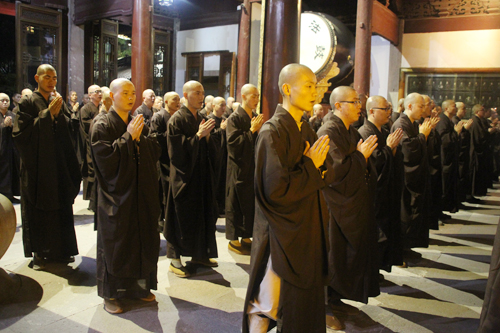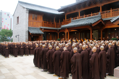 2016年10月20日凌晨4时,天降甘霖,秋风徐徐。云板声起,钟鼓齐鸣,佛号声声,320余位新戒弟子齐集圆通宝殿,排班对立。在开堂大初律师和诸位引礼师的引领下,恭请住持可祥法师率监院界义法师、定光法师,副监院法净法师佛前上香。随后,引领常住大众及新戒进行祈祷,愿佛力加持、国泰民安、世界和平。早课结束后,新戒弟子虔恭礼祖。