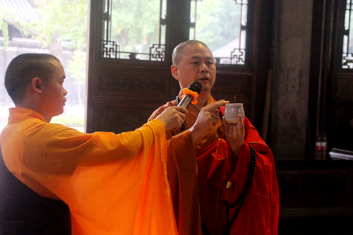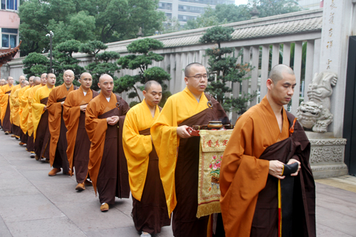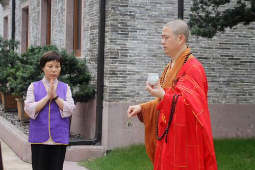 上午8时,举行结界洒净仪式。诸戒子齐集圆通宝殿,恭请可祥法师主持仪式,并引领大众唱赞诵咒,拂杨枝净水,遍洒戒场,令与会者心生淸净、三业无染。