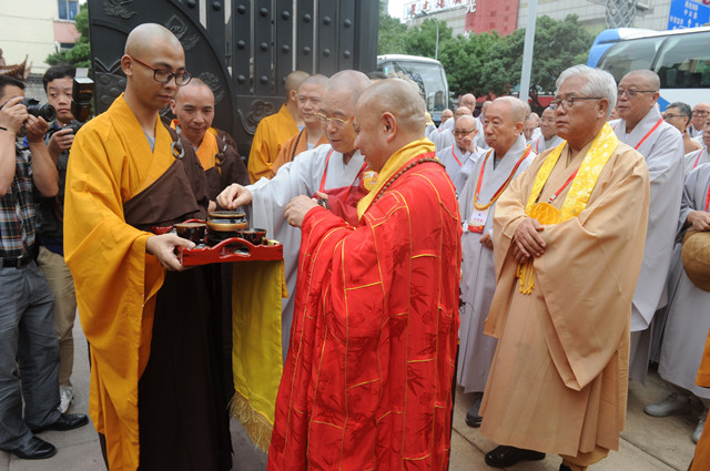 2016年10月13日下午,第十九次中韩日佛教友好交流会议中韩两国代表团莅临七塔禅寺参访,受到住持可祥法师、监院界义法师、监院定光法师、副监院法净法师等僧俗两众的热烈欢迎。