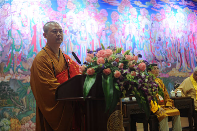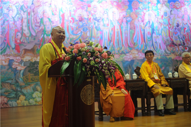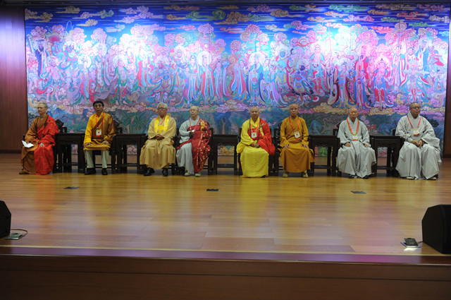 明生大和尚、春光长老等在报恩大讲堂主席台上就坐
