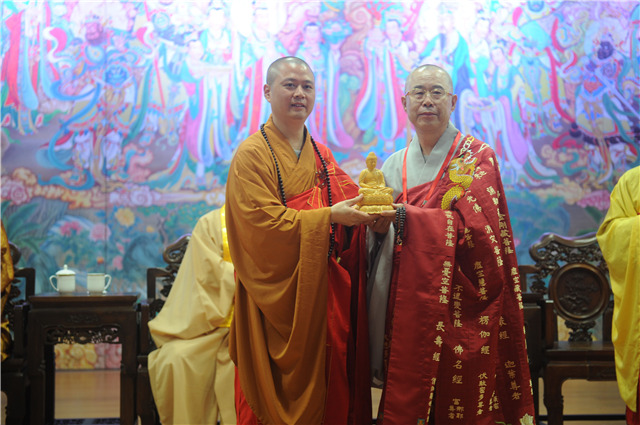 在欢迎仪式结束前,可祥法师代表七塔常住分别向明生大和尚、春光长老赠送了木质的释迦牟尼佛像。
