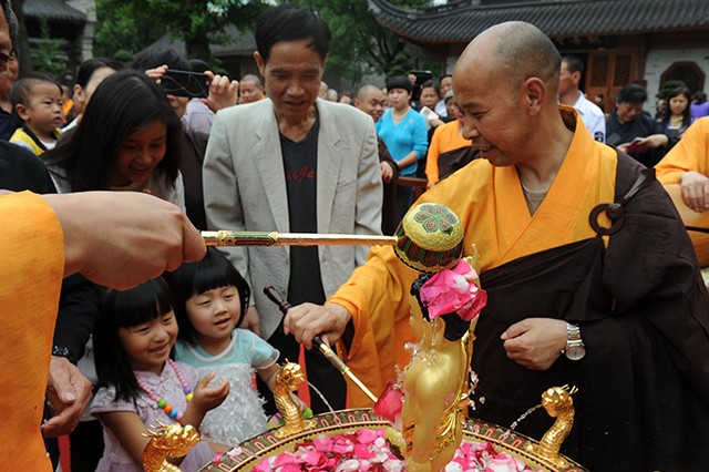 浴佛法会在七塔禅寺圆通宝殿前广场隆重举行。寺院住持可祥法师主法,在佛前宣读了祈祷正法久住、国泰民安的《祈愿文》,并为大众现场开示了浴佛的内涵,以及在生活中如何实践佛法,即勤修戒定慧,息灭贪嗔痴,福慧双修,圆成佛果。七塔常住四众弟子、义工、甬城信众及香客、游人等近500人参加了这场灌沐佛身、清净自心的庄严盛会。