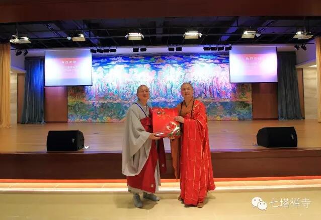 可祥法师向中方代表团副团长演觉法师赠送茶礼
