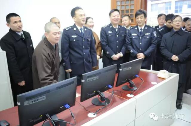 刘凯局长一行在可祥法师引领下,视察寺院安全进出口、指示标志、消防器材、电力设施、监控中心等。在视察中,可祥法师还向刘凯局长汇报了“烧头香”寺院组织机构、职责范围、人员配置、后勤保障等。对于“烧头香”安全工作,七塔常住在思想上高度重视,在组织上领导有力,在准备上充分周密,刘凯局长不仅十分满意,而且给予高度的肯定评价。刘局长强调,在人流高峰时要控制好流量,保障进香活动安全、圆满完成。