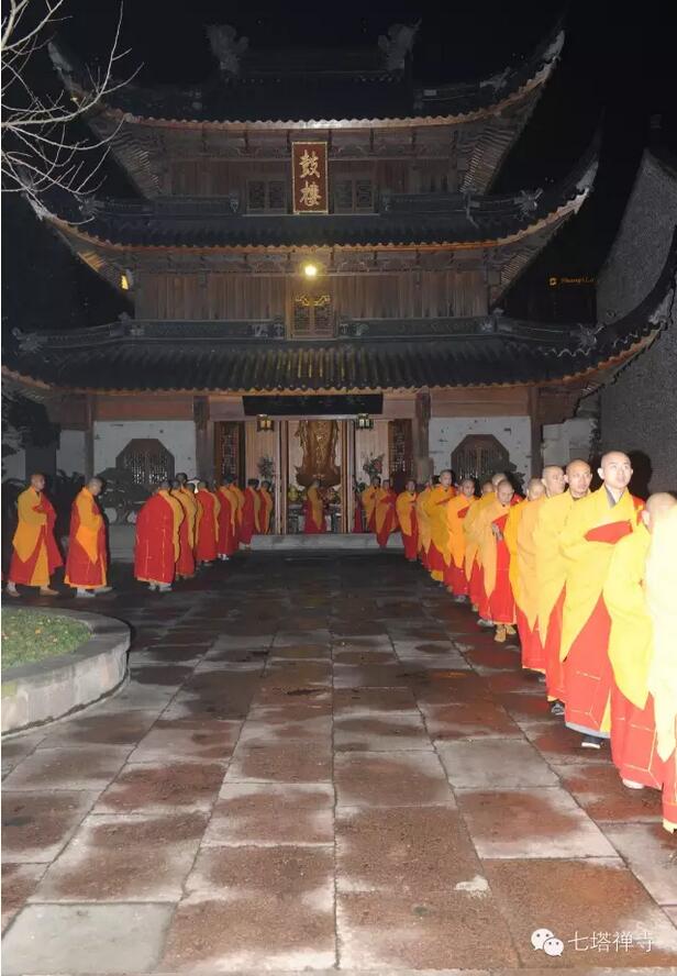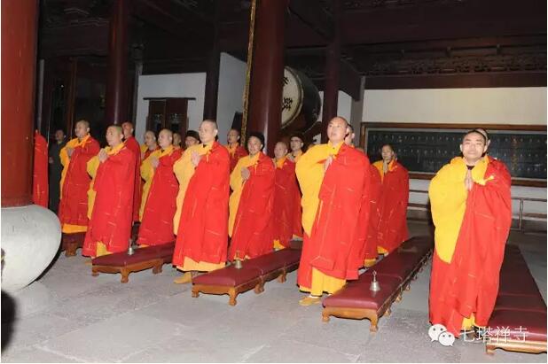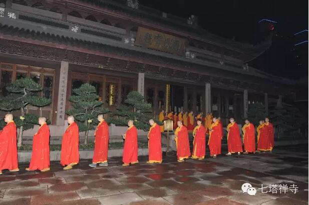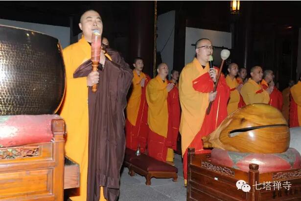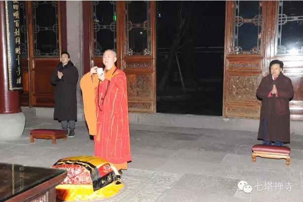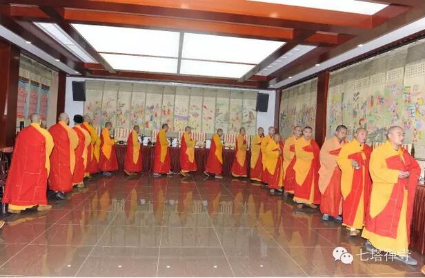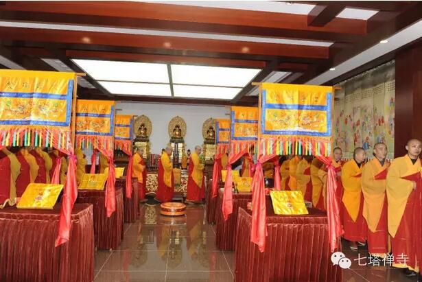2015年12月14日(农历十一月初四)晚6:00,七塔禅寺隆重举行“启建十方法界圣凡水陆普度大斋胜会道场”洒净熏坛仪式,法会由住持可祥法师主法,并领众法师与功德主持诵《大悲咒》,以杨枝净水遍洒本次水陆道场所设的各大坛口,通过诵咒净坛,令此道场清净庄严。整个法会如法如律,隆重庄严。
