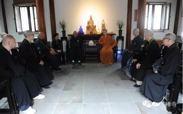 2015年9月寺20日,上午10:00,日本曹洞宗永平寺监院佐藤好春率团参访七塔禅寺,受到住持可祥法师等的热情接待,宾主双方在丈室进行茶叙交流。首先,可祥法师回顾了与永平寺前任监院森雄林、大田大穰及其他执事的交往,这次监院佐藤率团来访,必将在先前的基础之上深化了友谊。其次,可祥法师向诸位介绍了心镜藏奂、慈运皈依、圆瑛宏悟在七塔禅寺和天童禅寺皆担任过住持的历史情况。再次,可祥法师应客人要求介绍了宏智正觉的“默照禅”及如净长翁和希玄道元的禅法之内在联系与思想特点。