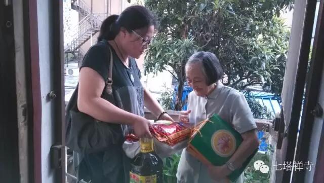 2015年9月15日上午,际中秋佳节前夕,受七塔常住的托,首座惟日法师、知客印喜法师及义工代表在七塔社区工作人员陪同下,向该社区30户孤寡老人与贫困家庭送上了净素饼、油、米等慰问品,祝福他们中秋佳节快乐,祝愿其身体健康。