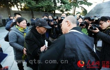 释良雄紧紧握住南京大屠杀幸存者金茂芝的双手